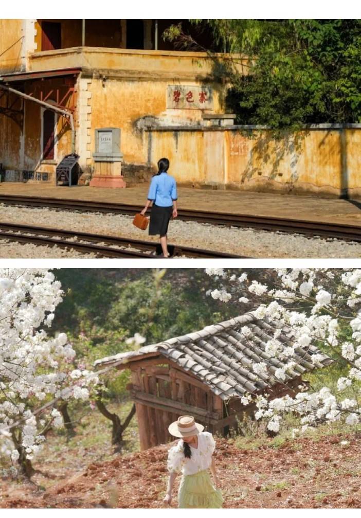 14:30到达【碧色寨·滇越铁路】,法式站房鹅黄墙面剥落如癣,【三面钟】锈针卡在1910。踩上米轨的瞬间,红土从枕木裂缝涌出,中国第一块【红土网球场】浮现而来。候车廊孔雀蓝木窗忽被撞开——百年未发的列车,正载着野象群冲进站长室的镜中。【芳华】拍摄的痕迹仍在其中,【滇越铁路】货运列车仍穿梭在【北回归线纪念碑】旁。