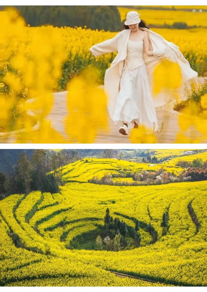 10:00 前往【螺丝田油菜花】。牛街“螺丝田”是由串珠岩溶漏地质地貌构成的自然景观,漏斗如此密集,形态如此奇特,目前尚不多见。这里的梯田是圈状的,远远看去像是螺丝上的旋纹。沿着梯田一圈圈往上延伸的油菜花,像无数金龙盘卧。