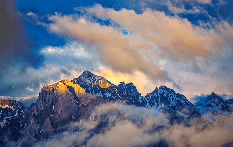 雪峰之白:山顶积雪如千年寒玉,在阳光下泛着温润光芒,纯净得令人屏息,晴空下,雪峰银雕玉琢般棱角分明,冷峻中透着神圣;晨昏时分,"日照金山" 奇观将雪山染成鎏金色,如黄金铸就的龙脊;