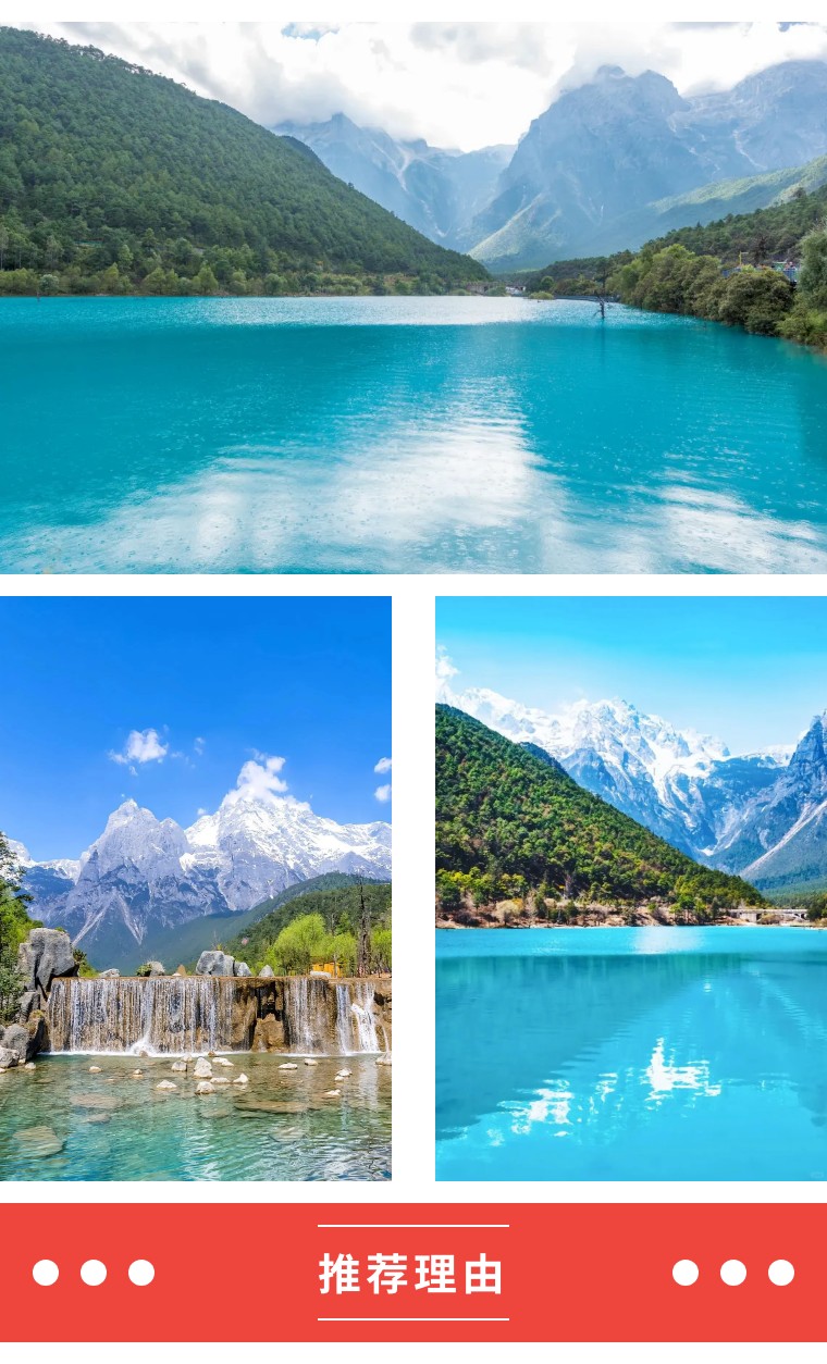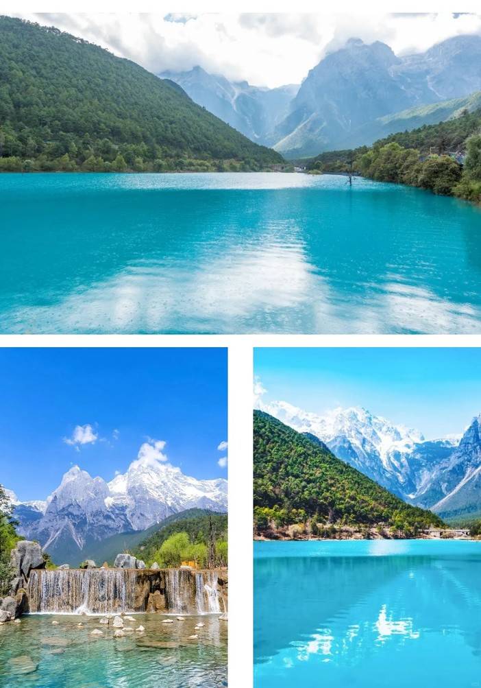 蓝月谷之碧:雪山脚下的蓝月谷,湖水呈现Tiffany 蓝,被誉为 "散落人间的蓝宝石"水面如镜,倒映雪峰,形成 玉甲银鳞在涧中,蜿蜒水底现玲珑的奇观;
