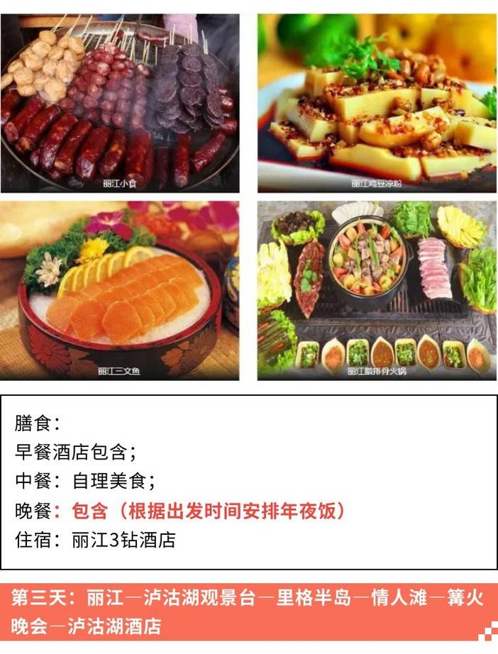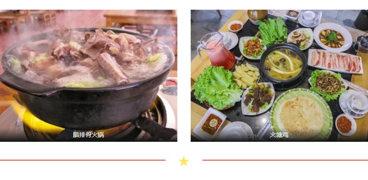 美食推荐:腊排骨火锅、三文鱼、黑山羊火锅、火塘土鸡、野生菌、丽江粑粑、鸡豆凉粉、纳西烤鱼等。