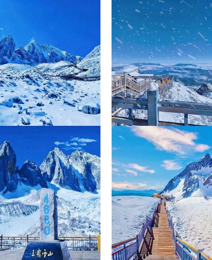 玉龙雪山:十三座雪峰连绵 75 公里,宛如一条银色巨龙横卧云际,鳞甲在阳光下流转生辉。主峰扇子陡海拔 5596 米,如擎天玉柱直刺苍穹,在蓝天映衬下尽显雄奇险峻。