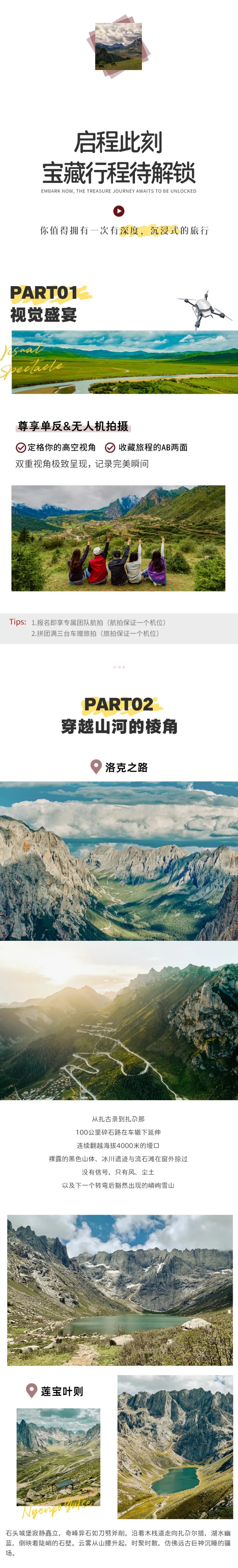 4、团期报名即送航拍,保证一个机位,团期满三台车赠送旅拍,一共保证两个机位