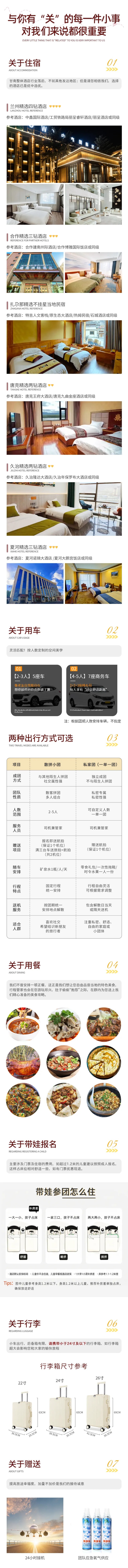 1、住宿:兰州4钻酒店标间1晚、合作市3钻酒店标间1晚、扎尕那不挂星藏式民宿标间1晚、唐克镇2钻酒店标间1晚、久治县3钻酒店标间1晚、夏河县3钻酒店标间1晚