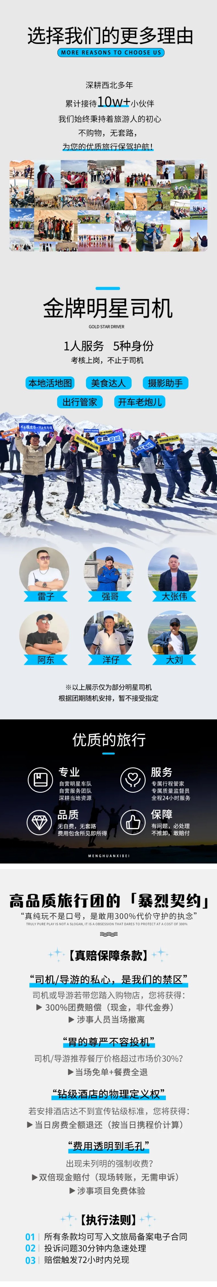 12、行程中司机、领队等工作人员拍摄的照片或者视频有可能会用于我司宣传线路之用,无其他用途;如您介意可联系我司第一时间删除,保证您的权益。
