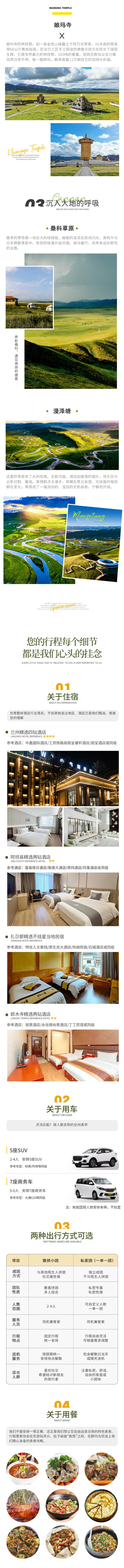 1、住宿:兰州4钻酒店标间1晚、扎尕那藏式民宿标间1晚、阿坝县3钻酒店标间1晚、郎木寺镇2钻酒店标间1晚