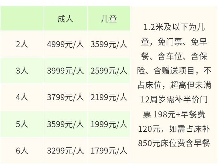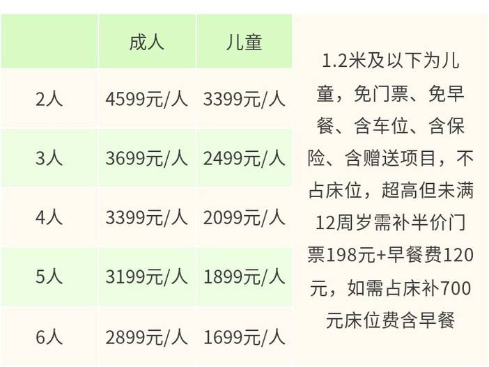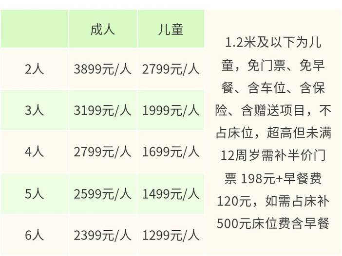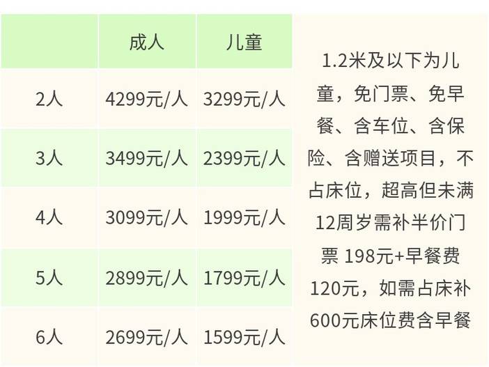 · 1.2米及以下为儿童,不占床位(与成人共用1张床铺)、免门票、免早餐、含车位、含司机服务、含保险、含赠送项目;