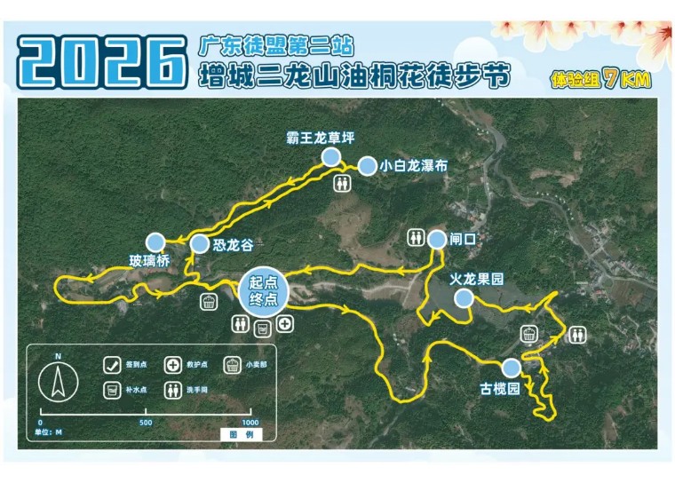 活动起点终点都设置在增城二龙山景区。最高海拔最高海拔318米,累计爬升约500米,全程计划用时约5-6个小时。