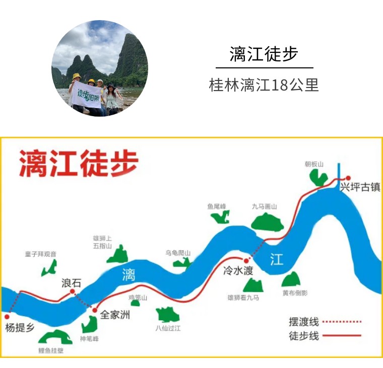漓江全长164公里,风光有山青、水秀、洞奇、石美“四胜”之誉,本次徒步其精华段杨堤-兴坪码头,全程18公里,用时6小时左右,沿途经过3个横水渡口,6个自然村。沿江景色美不胜收,有浪石风光、下龙风光,九马画山、黄布倒影等。