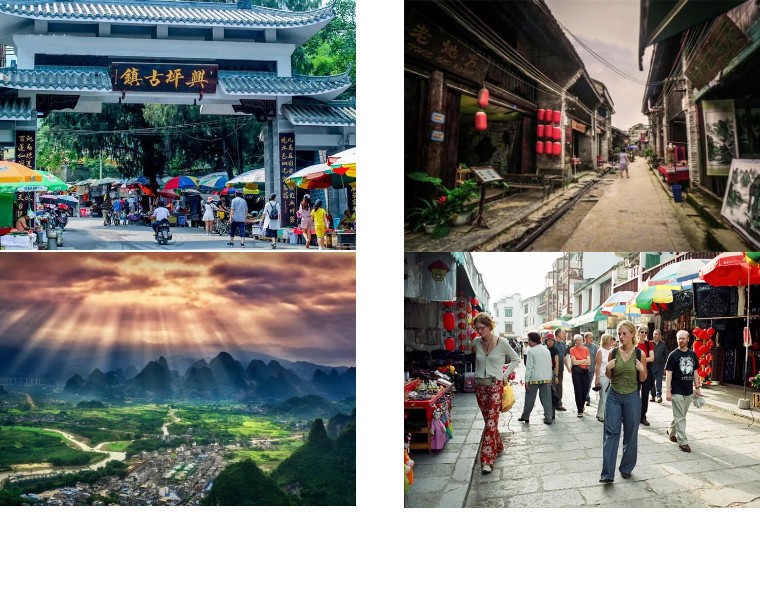漓江上一颗璀璨的明珠,位于阳朔县东北部。20元人民币的背景地就是在兴坪。具有1700多年历史,各类砖瓦结构的古建筑大部分保存完好,古街的东南侧狮子旦为熙平县城遗址,城墙轮廓尚清,随处可见古砖瓦陶瓷残片,只是原来车马来往人看人的繁华县城,呈现出一派青山幽幽、村舍几座的肃静氛围。