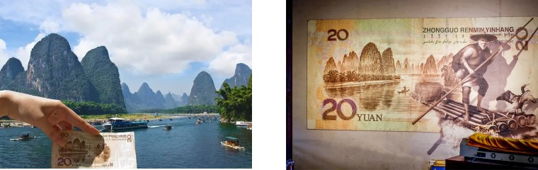 当你拿出一张20元人民币时,一眼就可以看出背面的山水图案取自兴坪风光。看镰刀湾上游方向,参差罗列的山峰倒映在碧清的江水之中,分明就是一幅巧夺天工的山水画。