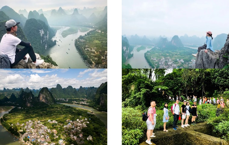 休息片刻,体力跟得上的朋友,可跟着领队登【老寨山】,单程约40分钟登顶,原路下山。登上老寨山,可以看到整个漓江湾和兴坪古镇全景。