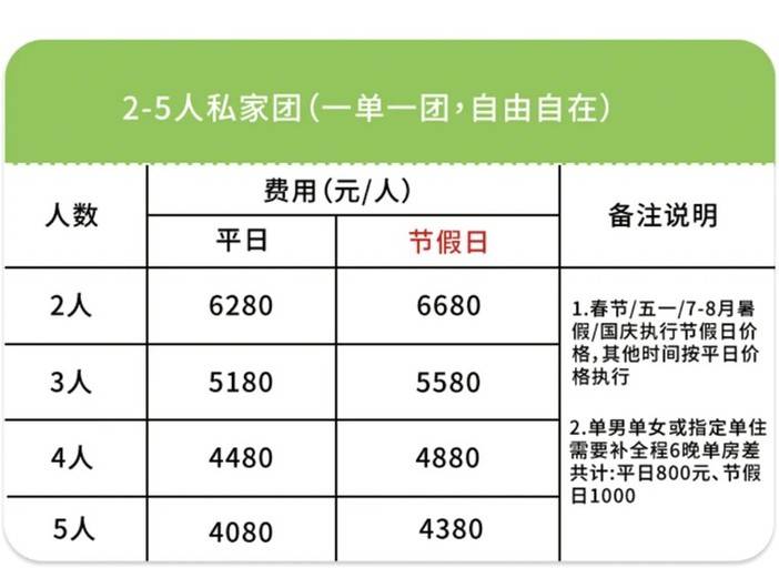 ➂ 单房差:单人报名默认同性拼房(拼房不成功无需另付单房差);指定单住或1成人带1儿童(需补全程6晚单房差价共计:平日800元/人;春节/五一/7-8月暑假/国庆1000元人)2人一起报名默认住1间房(如需分开住请主动说明)