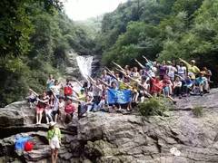 活动组织:健行户外官网:www.gdjxhw.com夏季炎炎,很多数人会选择待在家里吹空调,而大山阿婆田是夏季避暑好去处,多去走走,多看看这个世界;走着走着,你会发现:你已经停不下来了……天气很好,带上笑容,哼着歌曲,一路大巴狂奔,穿过竹林,走过石桥,来到了我们的目的地黎溪镇的小山村,阿婆田山脚下.国际惯例,先来张全家福镇楼.徒步开始,风风火火出发,走着一段弯弯曲曲的水泥路,绕过农田. -----“快看!瀑布!” -----“真的耶!”在村口的竹林处远远就看到这一幕水帘,顿时觉得很清凉。沿着石阶而上白水寨瀑布几十米倾泻而下,下面雾气湿气很重,乱石很多路很滑。从地下走过时,满身处在水气当中,不一会我的眼镜片都白茫茫一片了。大家相互帮忙走过了这艰难的拔升较大的一段。暑假的原因,这次活动的小朋友很多,三个小男孩十足三个小领队,一路走在前面开路,当他们爸妈都累的不要不要时,他们此时并无累意,奔跑吧