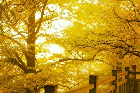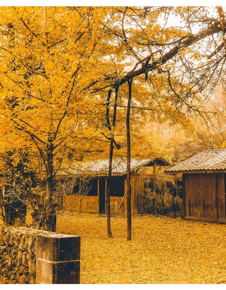有人说,一个把黄色都用尽了的小村庄,是个浪漫的地方!能想到的最浪漫的事,就是坐在这里的摇椅上,和你看着漫天飞舞的金黄,慢慢地摇;想做的最浪漫的事之一,就是被你牵着手,旁若无人地走在金色堆砌的魔毯上,留下只属于我们的“银杏树之恋”!