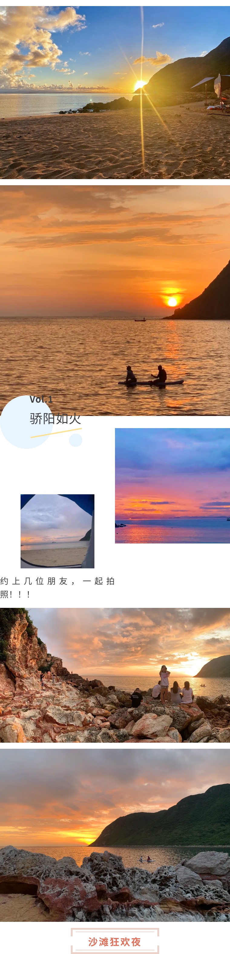 05:30 早起的亲们可以在月亮湾沙滩看日出,感受清晨宁静的海滩。吹着海风,踏着海浪在沙滩上嬉戏,记得穿上漂亮的衣服拍美照哟。