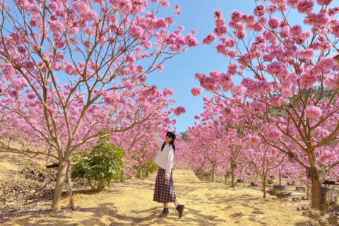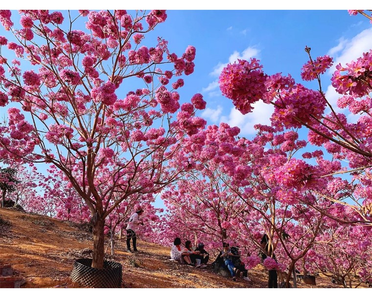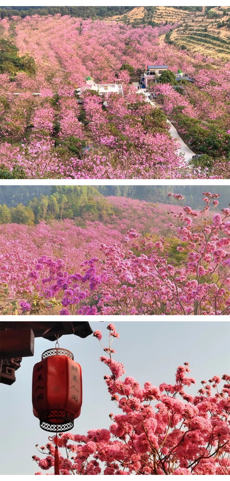 14:50 到达【绿美生态园】,占地千余亩的紫花风铃木林场,每逢冬季,这里的风铃花争相怒放,浪漫花海开满山头,形成一片姹紫嫣红的海洋
