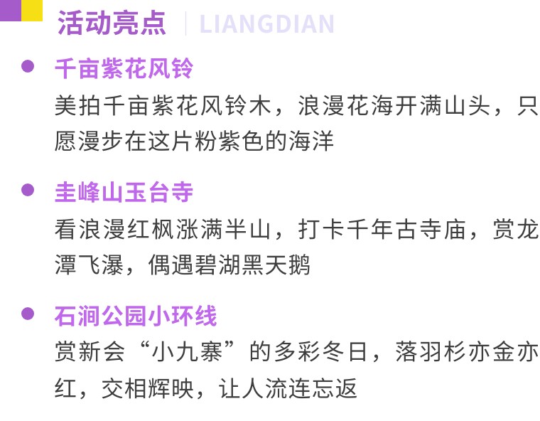 1. 不含紫花风铃木林场门票团队票38元/人,出发当天领队车上收取(免票人群:身高1.2m以下儿童、75周岁以上长者)