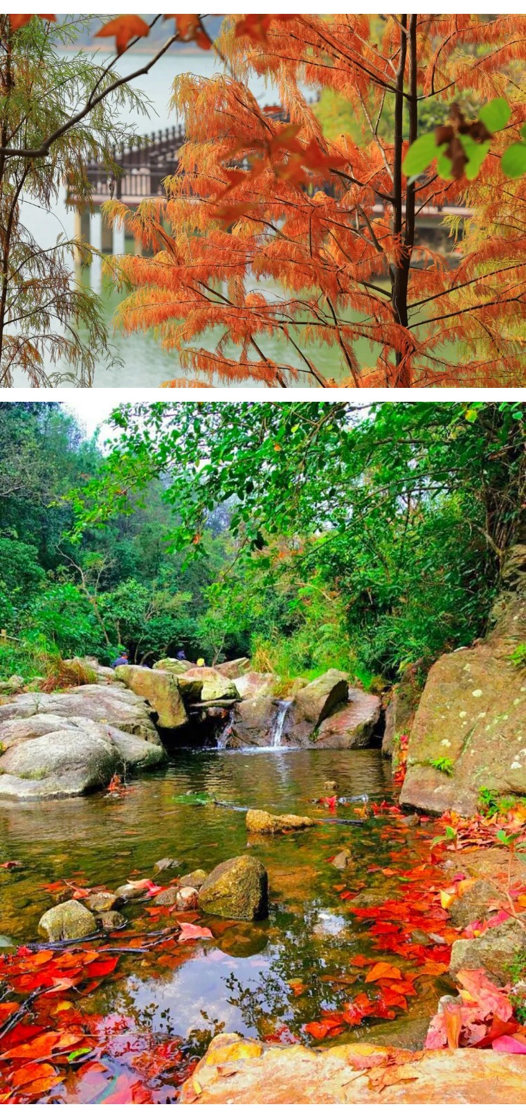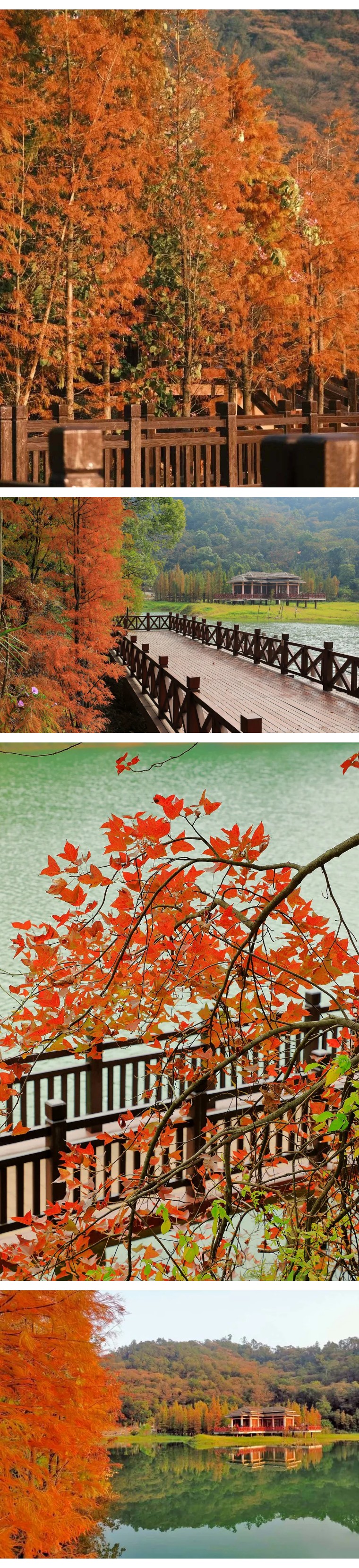 12:50 到达【石涧公园】,漫游小环线,挺拔的落羽杉披上了红装,宛如童话世界。漫步在水杉林亲水栈,享受小九寨的多彩风光