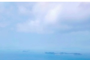 山顶两侧是大海、远处飘浮的小岛、天空的白云