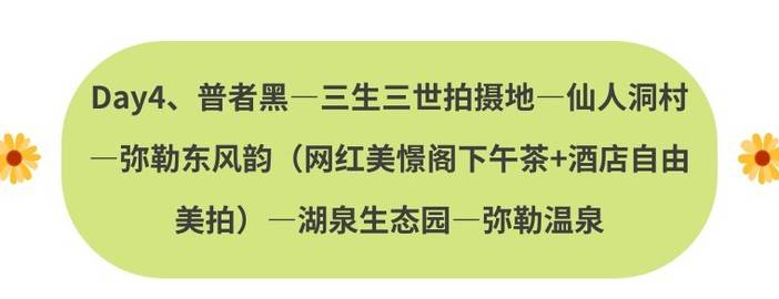 亮点:探访彝族仙人洞村+漫步欣赏《三生三世》取景地晨景+弥勒东风韵+网红美憬阁下午茶(酒店自由美拍)+湖泉生态园