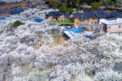 数万株李树枝头绽放出白色的花朵