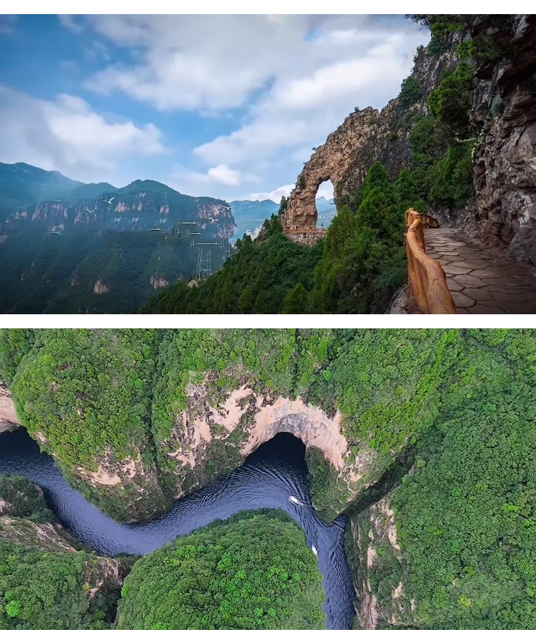 天桥飞跨于南北两座危崖之间,跨度50米,高200米,宽2-5米,厚度10米以上,呈天然石拱桥状。远远望去颇似一座巨大的山门洞开。其形状、构造与古今中外人造砖石拱桥有异曲同工之妙,真乃鬼斧神工、天造地设的世间奇观。