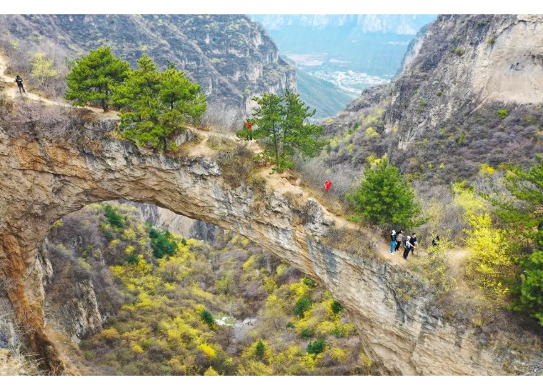 天生桥是猫路上的重要景观之一,它位于猫路将要上到山顶的东侧,英姑山峰顶,是迄今我国北方发现的最大的天然石拱桥。