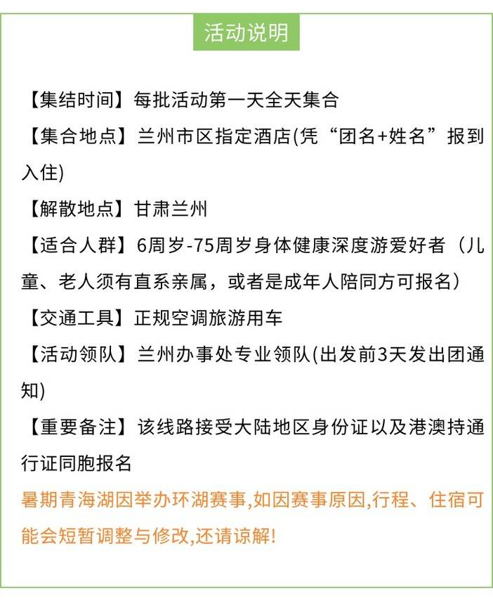 4.由于青海湖二郎剑景区过于商业化,故行程中不作安排,2025年根据青海湖的游览政策,开放的拉泽观景点可以直达湖边且无需门票(需摆渡车30元/人(参考价格),费用自理 ),小伙伴们不仅可以零距离欣赏青海湖,在指定季节还可以看到国家二级保护动物湟鱼,领队还会带大家在靠近湖边的骑行赛道领略青海湖最原始,最本真的容貌;