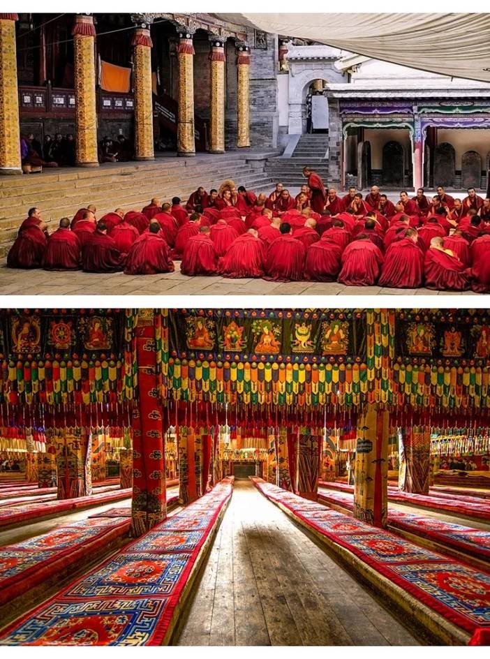 塔尔寺藏语称为“衮本贤巴林”,意思是“十万狮子吼佛像的弥勒寺”。这里有传说中的菩提树,有蔚为壮观的大金瓦殿,有栩栩如生的酥油花和绚丽多彩的壁画,随处可见的白塔排成一排,是信仰的具象化。寺庙的红砖绿瓦非常出片。有喇嘛拾阶而上,两旁绿树成荫,抓拍下他的背影,艺术感满满。
