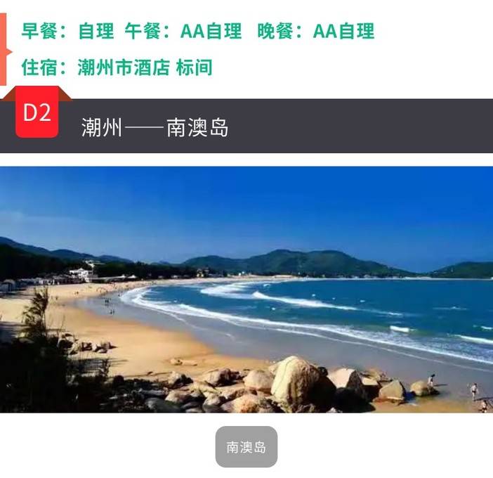 2、住宿:潮州市区酒店1晚住宿(含早),南澳岛酒店1晚住宿(含早)(活动前4天以上单人报名保证拼房,拼不成不用补房差。临时报名或活动前3天内报名,拼不成需补房差)