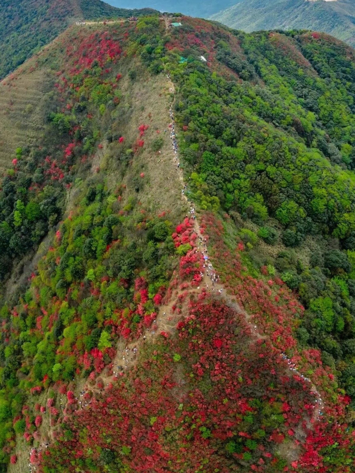 从半山腰看下去能看到上山路过的水库,山清水秀,花开满山,行走其间,就如进入了红花隧道,登山也变得更加有乐趣。