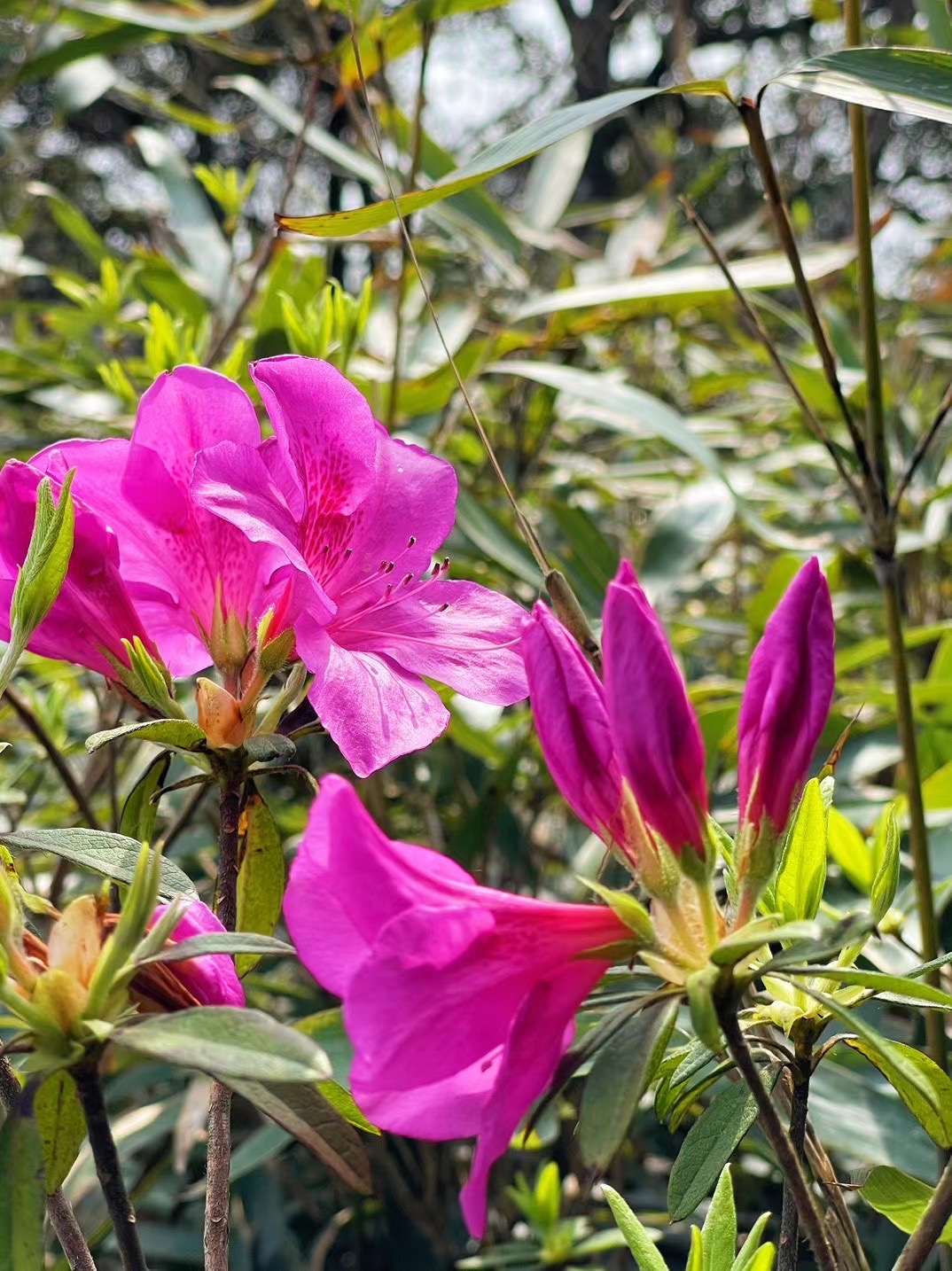 山上一朵朵的杜鹃开满枝头,粉红的、鲜红的、一蔟簇、一丛丛镶嵌在山坡上、丛林中、石头旁。