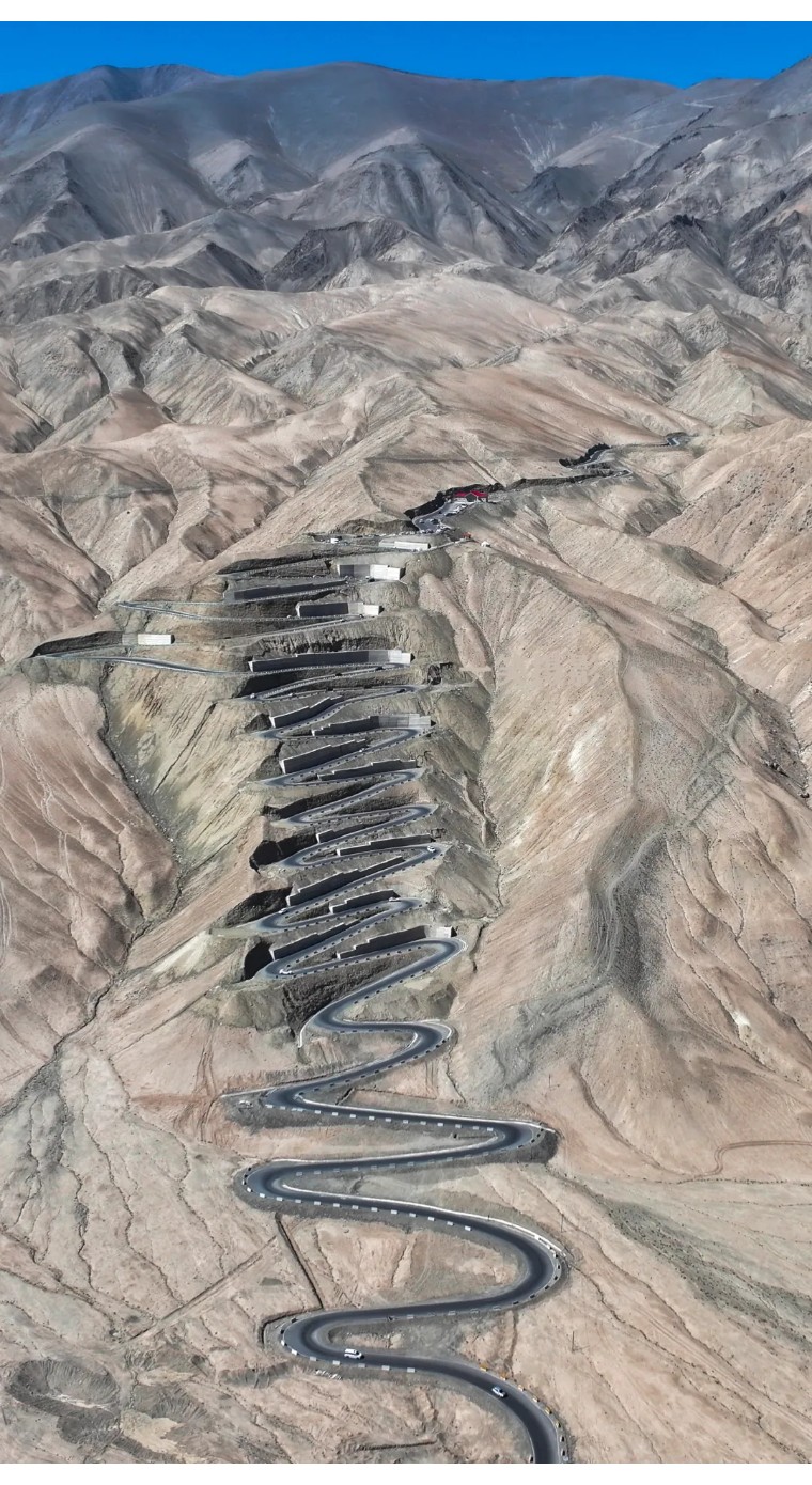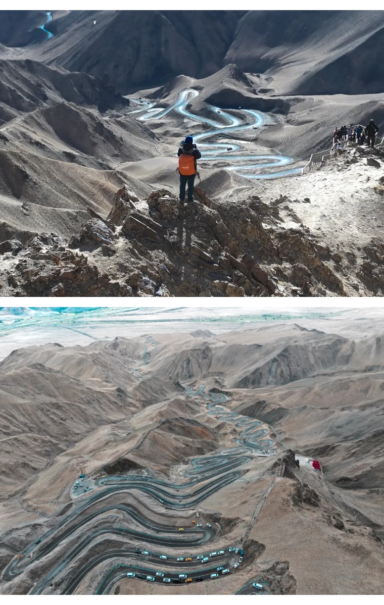 今天我们去网红打卡点盘龙古道,黑色公路与土色山体的完美配合,再加上远处连绵的雪山,这只属于帕米尔高原。盘龙古道上众多S弯道,网上盛传多达600多道!并且它的弯道大部分都超过180度,有些甚至270度,无论视觉体验,还是驾驶体验,都会让人肾上腺素激增,心潮澎湃,热血沸腾。盘龙古道究竟多少个弯呢?内地的朋友一语双关说:“今日我走过了人生所有的弯路,从此人生尽是坦途。