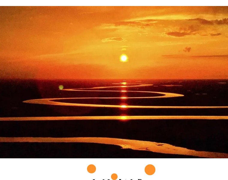 九曲十八弯像一幅油画镶嵌在巴音布鲁克草原,阳光折射下,九轮红日映在河弯。