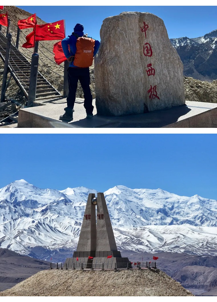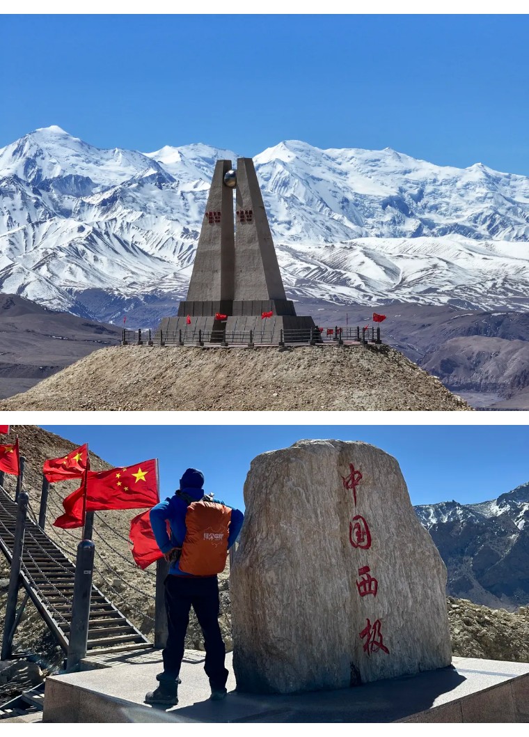 早餐后我们前往祖国最西的地方,打卡西极石碑。坐落于克孜勒苏柯尔克孜自治州乌恰县吉根乡的斯姆哈纳村,也称西极村,这是中国有人居住的最西端。从喀什出发大约260公里,喀什出发翻越海拔2971米的阿克托达坂后,过加斯木桥即是天山和昆仑山的交界处。在缓冲带停好车,眼前即是喀什噶尔河的支流克孜勒苏河,左边黑色的是昆仑山,右边红色的是天山。继续前往在乌鲁克恰提乡附近可以观赏开阔的河谷和牧场,以及遍布周边类似丹霞彩丘的红层地貌,如果碰到下雨天,河水也会变成红色。再往前走到达西极停车场。停好车就可以沿着木栈道拾级而上到海拔3100米标识着经纬度的中国西极石碑处。中国西极也即中国领土最西的地方,这里有个77号界碑,是国人能够到达的最靠中国西极的界碑。