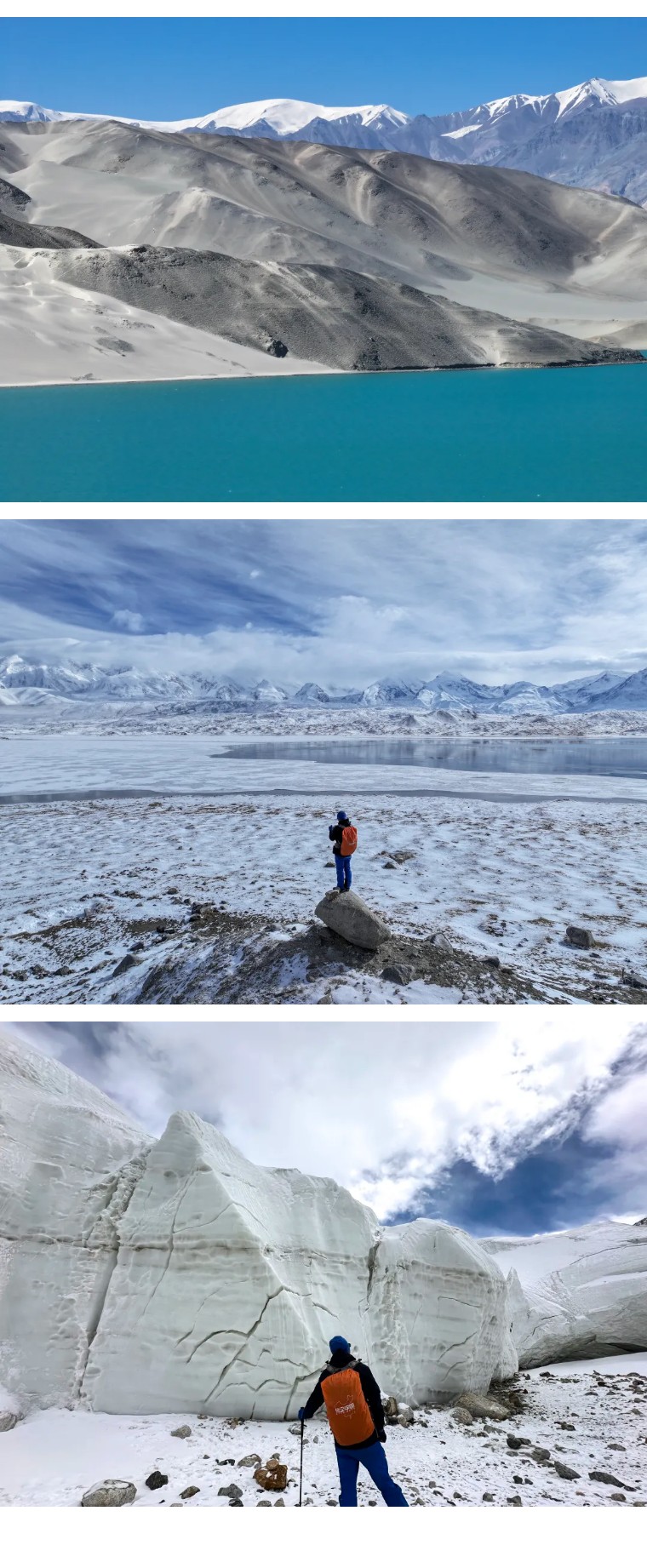 早上我们将沿着314国道前往白沙湖,白沙湖又叫恰克拉克湖,白沙山和白沙湖位于通往塔县的G314国道边上,由于千百年来高原风沙的侵袭,使得沙湖周围的山遭受侵蚀风化成灰白色的沙子,形成了沙山,这里湖面如镜,白沙如雪,景观令人震撼,在路上看完白沙湖,我们去往帕米尔高原有着黑湖之称的卡拉库里湖,在大漠深处感受一下塞外江南的那份悠然自得,卡拉库里湖位于海拔7546米的冰山之父山脚下,是一座高山湖泊,它是世界上稍有的高原湖泊,俗话说,有山 有水 才有情调,天气好的时候,幽蓝的山脊倒映在更加幽蓝的水面,湖光山色混为一体,水面景色那叫一个完美,大概这就是人间仙境了吧,这一天的行程最美,高原湖泊加雪山,真是人间仙境,带着美景的回味,我们继续帕米尔高原景区的慕士塔格冰川公园,慕士塔格冰川公园位于世界著名的“冰山之父”7546米的慕士塔格峰裙带下,平均海拔5000米,有美丽的“绿弓湖”在此停留,在这里可以看到冰川的雄伟,冰蛇的秀丽,冰塔、冰洞的多姿多彩,四层冰湖的柔情和峻冷。晚上我们入住塔什库尔干县酒店。