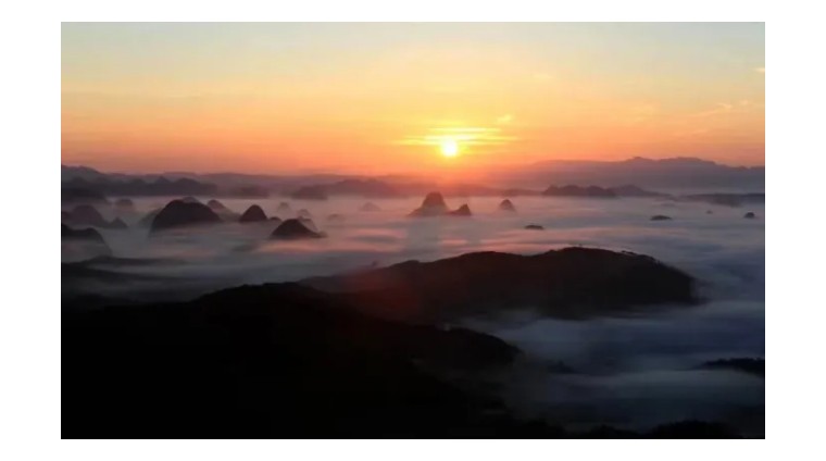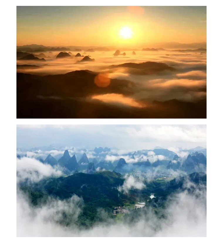 抵达山巅,方知半山浸染半雾半霞海,远眺古镇、喀斯特小山包,在绚烂的彩霞映照下,实在是美得让人感慨不已。
