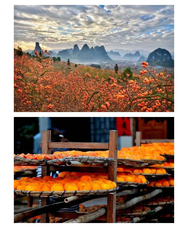 恭城的柿树栽培历史悠久,自然条件得天独厚,每到柿子成熟时节,一路可以欣赏到红红火火的柿子像灯笼一样挂满枝头,点缀漫山遍野,宛如红色的海洋,构成了一幅幅美丽的山水画,同时家家户户开始加工柿子、晾晒柿饼也是一个非常壮观的景象。