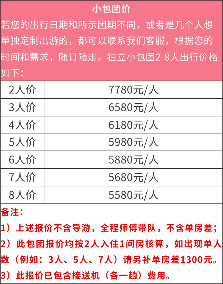 3、单房差:1300元/人(如遇到单人报名,我们会尽量安排同性拼房,实在没人拼的情况下,需要自补单房差。)