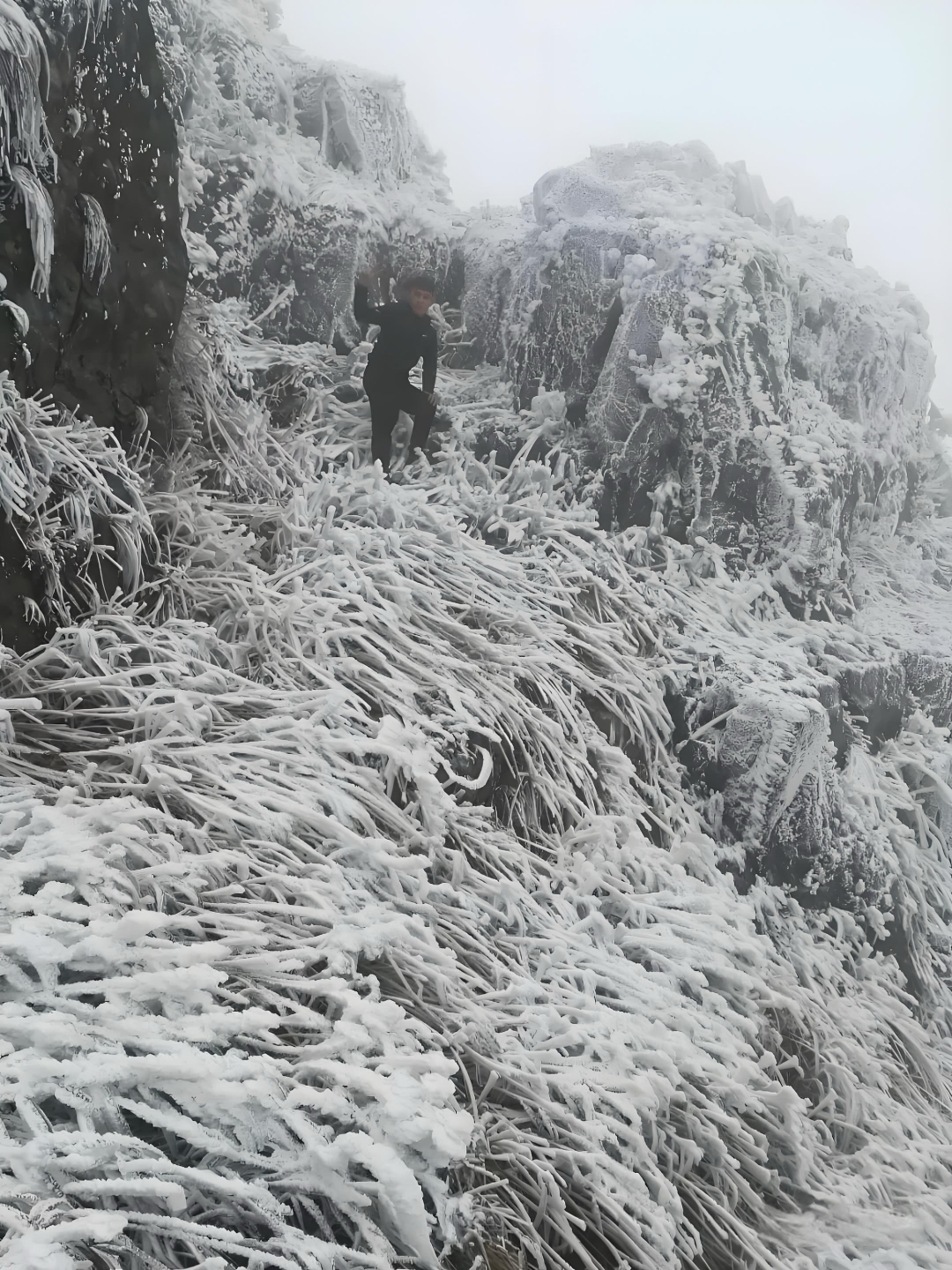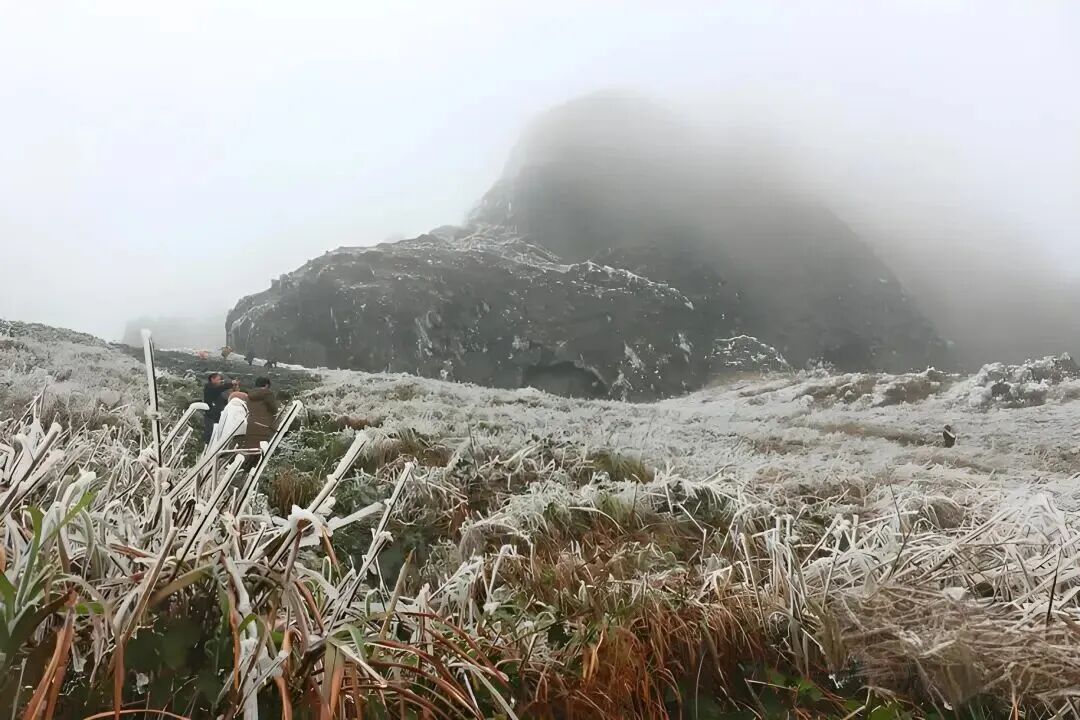 当寒潮席卷时,大圣山又展现出别样的风姿。海拔1170米的大圣山是横县出现雪淞、雾凇机率最大的地方。山上的雪淞、冰挂不断给人惊喜,晶莹剔透的冰花挂在树枝上,奇特的冰花雾凇景观宛如冰雪王国。
