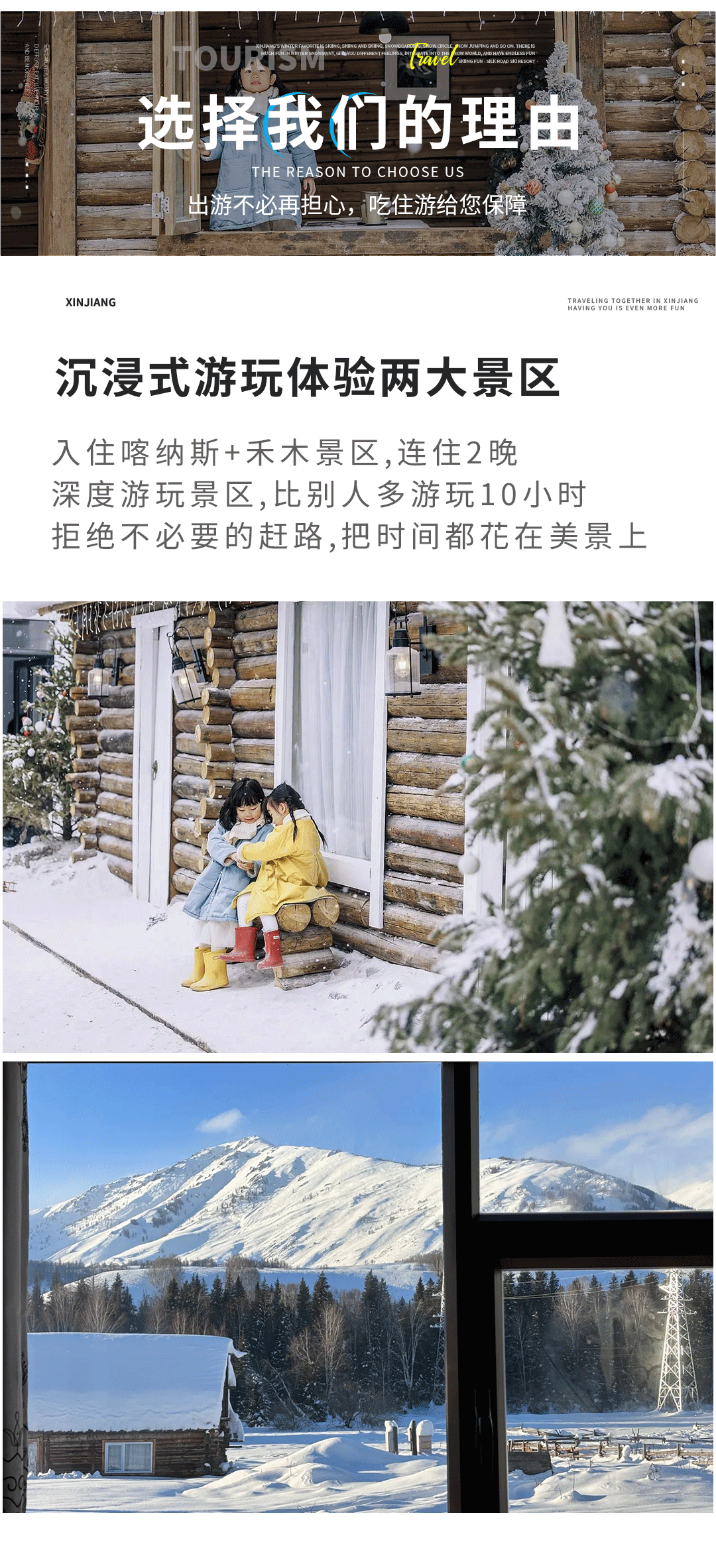 之后前往景区入住山庄,即可开始享受禾木的冬天。冬季的禾木银装素裹,白雪皑皑,一片白雪与灰色白桦林的映衬,显得那么安静与反差。在这里体验围炉煮茶,看大雪满天,它又回归到本就属于这里的静谧和纯净。小朋友们还可以前往与小鹿来一个亲密互动,摄影师会为我们记录下美好的瞬间。