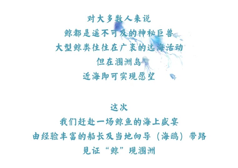1、涠洲岛1次出海寻鲸费用(寻鲸为自然概率事件,不能确保100%能寻鲸成功;根据海况确定出海时间,如遇天气不允许出海,平日退还寻鲸费用280元/人,春节假期退还寻鲸费用380元/人);