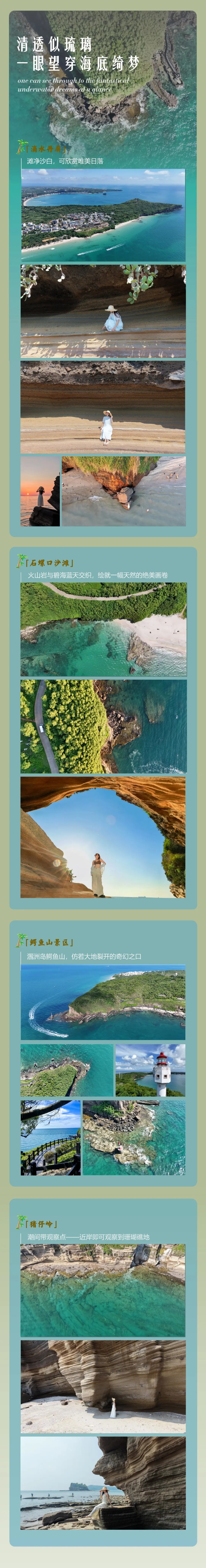 15:30 乘坐观光车进行环岛游,去人迹罕及的猪仔岭拍摄大片,潮位合适的时候我们在岸边观察活体珊瑚、潮间带生物,途径环岛咖啡、蓝桥、贝壳沙滩等风景优美的区域,边喝咖啡边欣赏优美的景色;