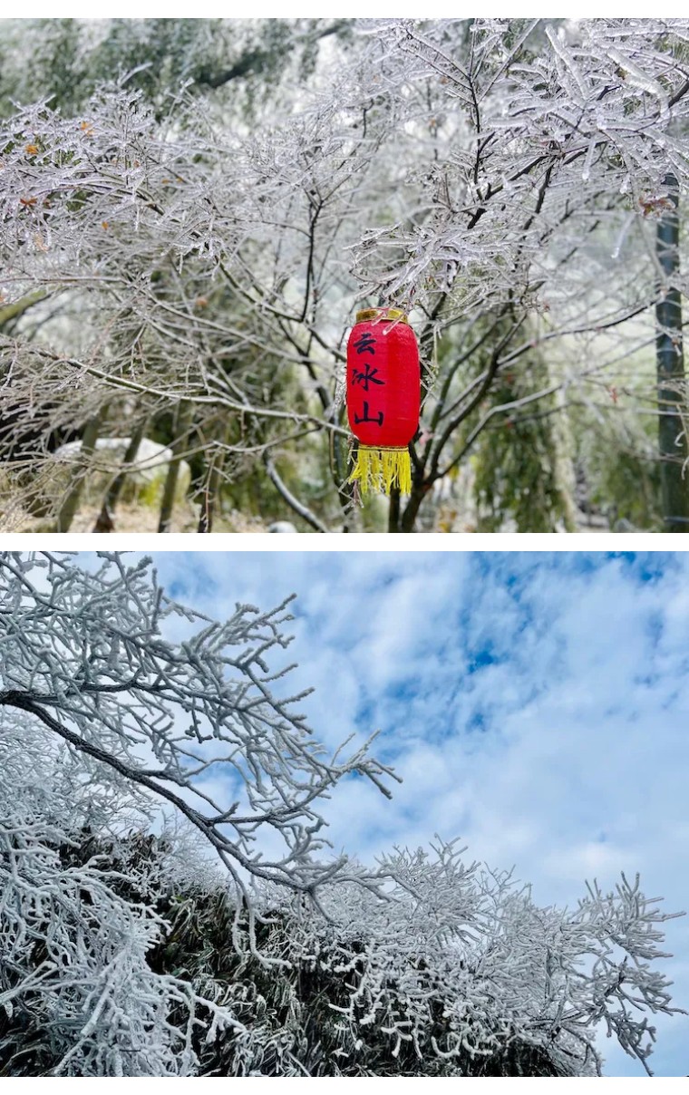 云冰山的冬天,有着南方罕见而迷人的冰雪景观,草木披上一层冰霜,伊然一派北国的风光。