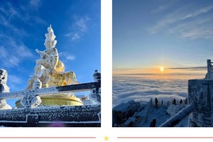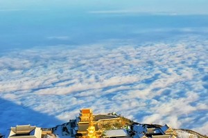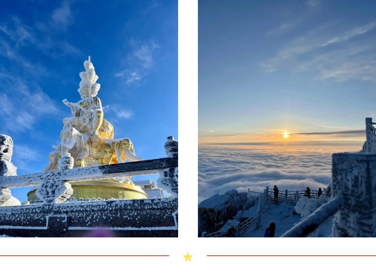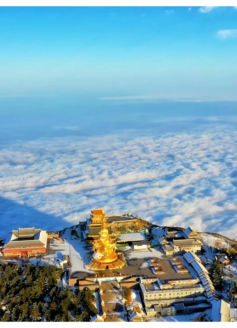 09:30-12:00:游览峨眉山金顶。峨眉山金顶海拔3079米,是峨眉山的象征。金顶上有金、银、铜殿,其中金殿为铜铸鎏金工艺,堪称一绝。在这里,您可以欣赏到云海、日出、佛光等自然奇观(视天气情况而定)。站在金顶之上,俯瞰群山,云雾缭绕,仿佛置身于仙境之中,感受大自然的神奇魅力。