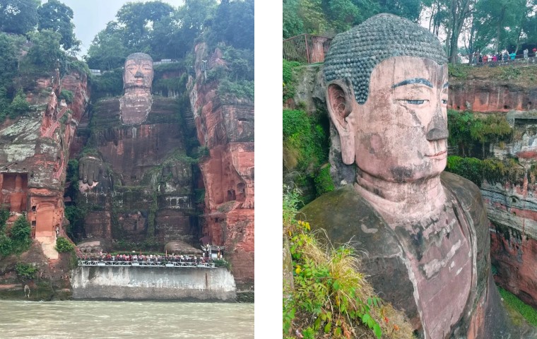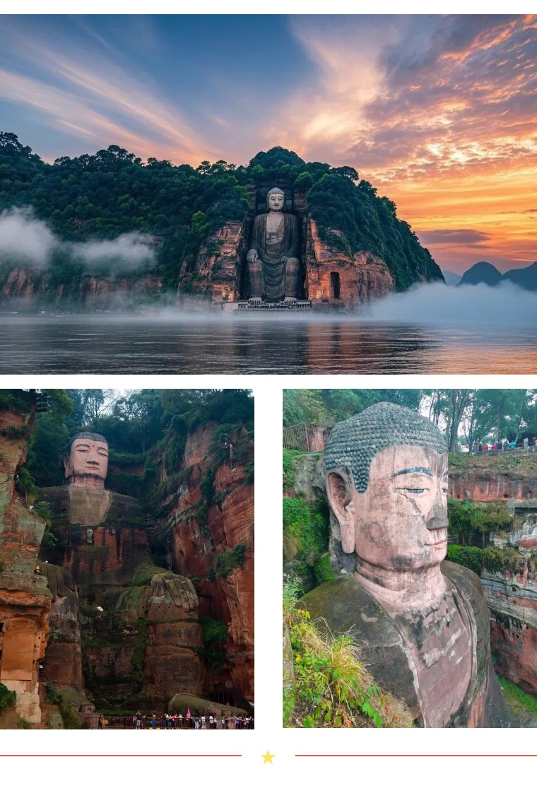 乐山大佛:山是一尊佛,佛是一座山,位于四川乐山市市中区岷江、青衣江、大渡河三江汇流处的凌云山岩壁上,是世界现存最高最大的石刻弥勒坐佛、世界文化与自然双遗产(1996 年与峨眉山联合列入)、国家5A 级旅游景区,素有 "佛是一座山,山是一尊佛" 的千古绝赞。