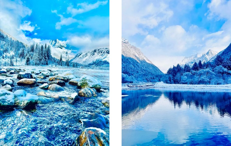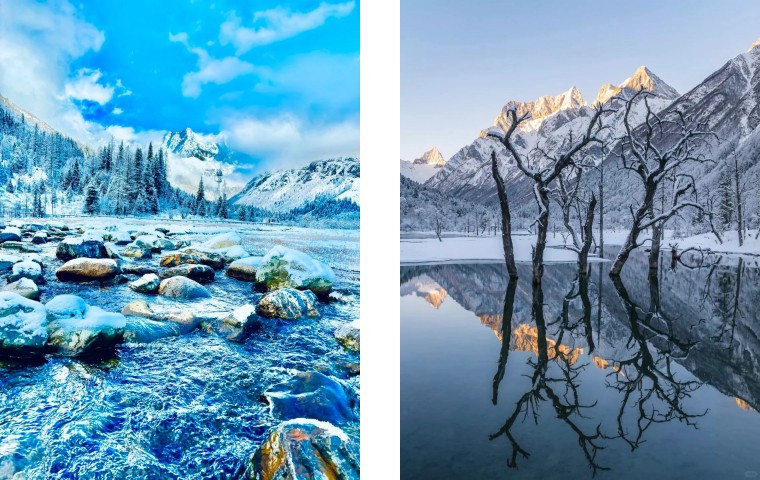 雪、秀、奇、近—— 集雪山巍峨、景色秀丽、景观奇特、距离都市近于一体,是 "离天堂最近,距城市不远" 的绝世秘境。下雪的四姑娘山比北欧还美❗️❗️当双桥沟的雾凇挂满枝头 当长坪沟的溪流凝成蓝冰 当幺妹峰的晨光吻醒云海 这里不是北欧,是离城市最近的雪山童话;