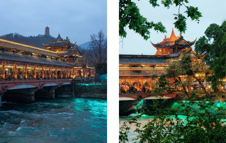 17:30-19:00:南桥夜景。南桥是都江堰的标志性建筑之一,夜晚的南桥在灯光的映衬下美轮美奂,被称为“蓝眼泪”夜景。桥下的岷江水在灯光的照射下泛着蓝色的光芒,与桥上的古建筑风格相得益彰,您可以在桥上拍照留念,感受都江堰夜晚的独特浪漫氛围,也可以在桥边的夜市中品尝一些当地的小吃,结束美好的一天。