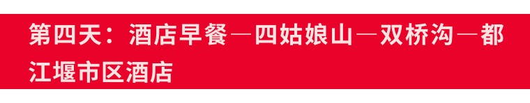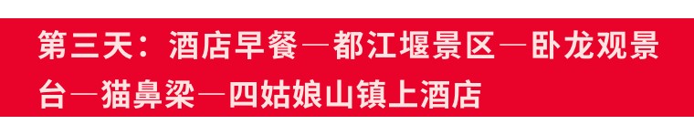 2、全程门票:熊猫谷门票、都江堰门票、四姑娘山双桥沟门票、乐山大佛、峨眉山门票;